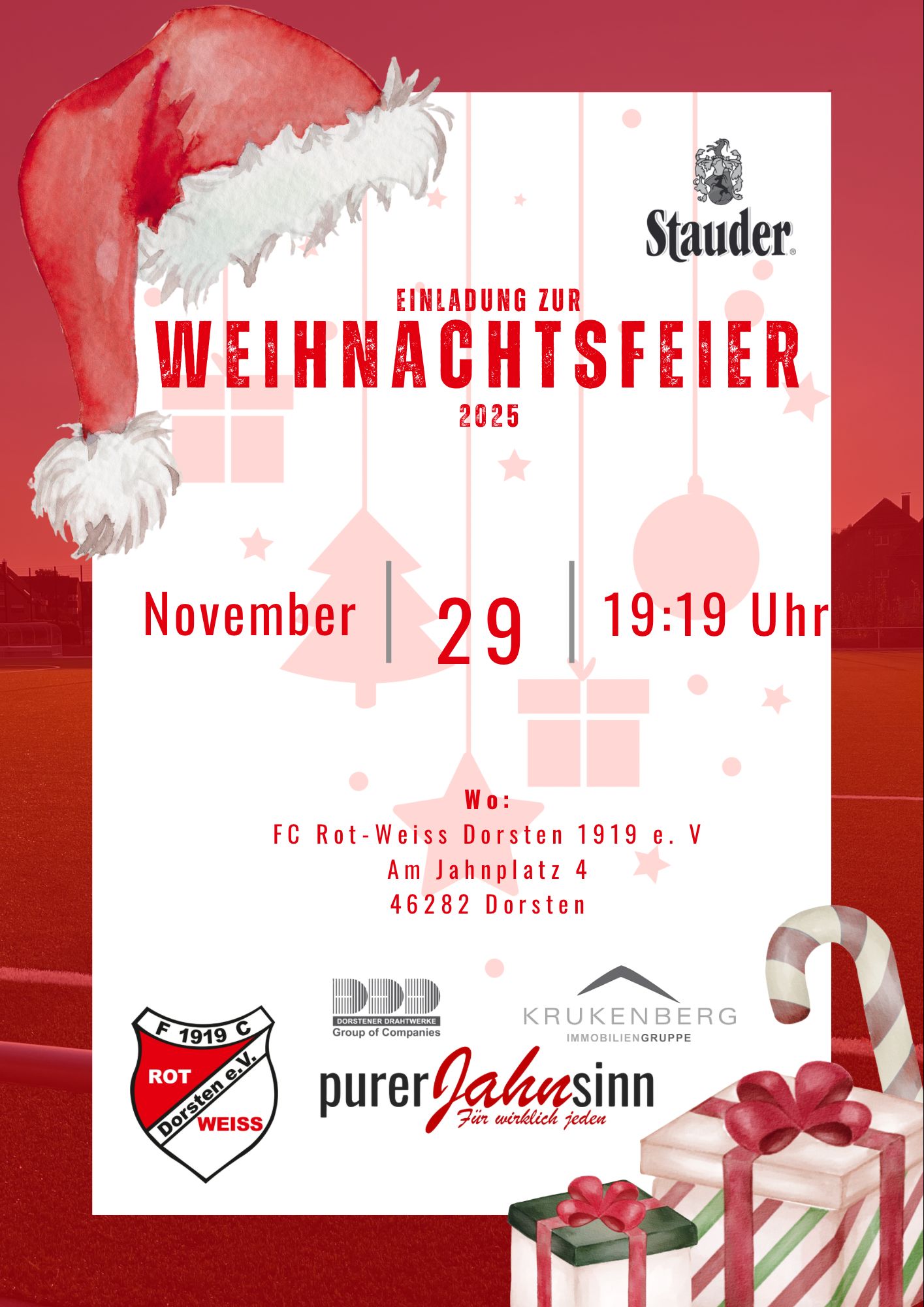 🔴⚪ SAVE THE DATE! 29.11.2025 – 19:19 Uhr Im Vereinsheim heißt es wieder: ✨ Spieler des Jahres (1., 2. und Ü32 Mannschaft) 🎄 Ugly Weihnachtssweater-Party – kommt im schlimmsten Pulli! 🎉 BINGO – mit tollen Preisen! Eingeladen sind: 👟 Spieler 🧢 Betreuer ❤️ Fans … einfach alle, die Rot-Weiss leben! 🍟🥤 Speisen & Getränke jeweils nur 2,00 € 🔥 Perfekt für einen gemütlichen, lustigen Abend in rot-weißer Runde! 📍 Vereinsheim Wir freuen uns auf euch 🔴⚪🔥